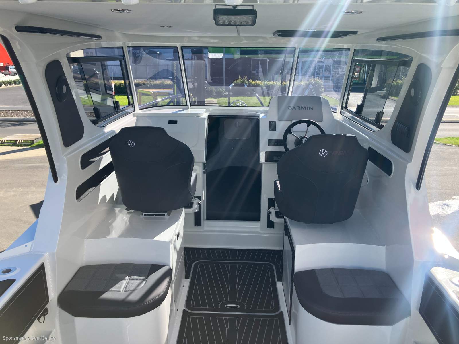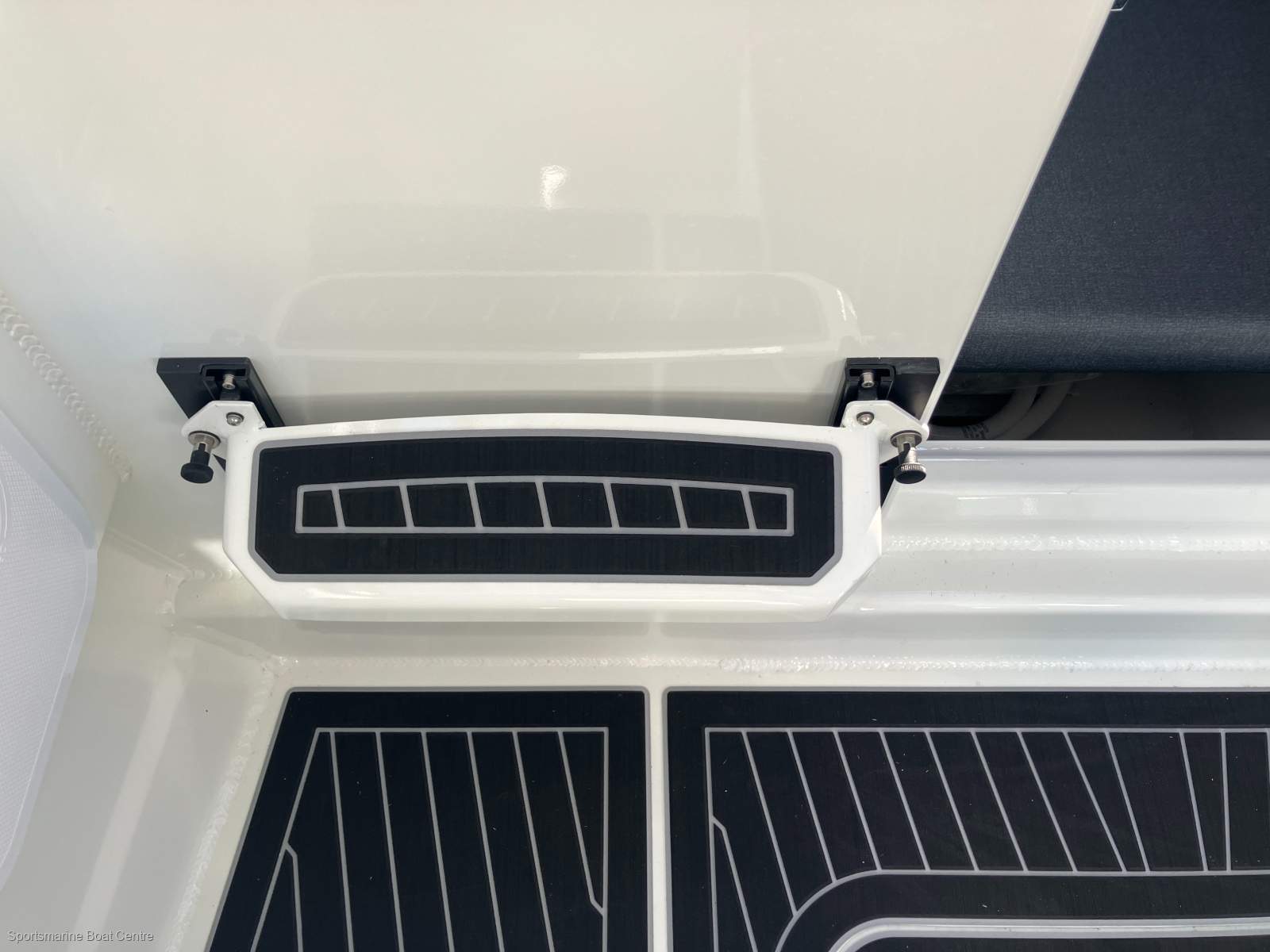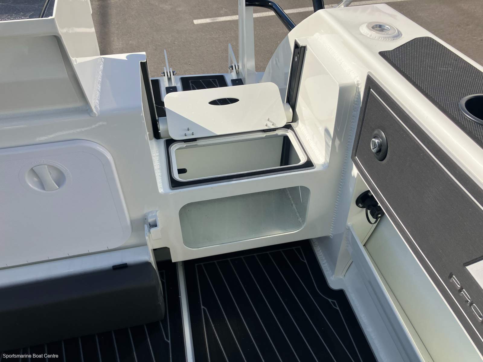 Anchor pack - Drum winch 1500SS, Large bait station, Live bait tank, Cabin sliding door, Cage on swim step with boarding ladder, Adjustable foot steps, Fresh water tank (55L) & pump, Fresh water outlet, Fusion stereo, Gallery Fridge, Roof hatch, Hard top solar panel 100w, Hard top head lining with 4 x Downlights, 2 x Hella LED lighting kit, Hella rear facing floodlights, Knee switch hand wash, Minn Kota bow mount bracket, All rails black, SeaDek flooring complete inc footrest, swim step & gunnels, Port seating curved with drawer, Starboard seating curved with Fridge, Seats bolstered includes slider, Toilet - electric flushing, Stone chip cover, Tinted windows, Windscreen wiper including fresh water washer.