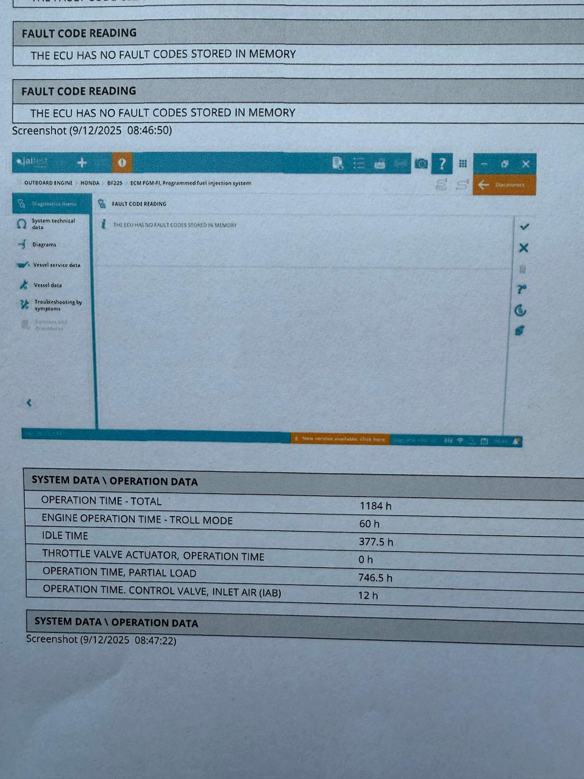 Up for sale is my 6.2m Harriscraft powered by a reliable 225HP Honda outboard with 1184 hours. The computer report (see photo) confirms the hours and operational stats. The motor is exceptionally clean, has no leaks, maintains excellent compression across all cylinders, and has been professionally maintained by a reputable local outboard mechanic.