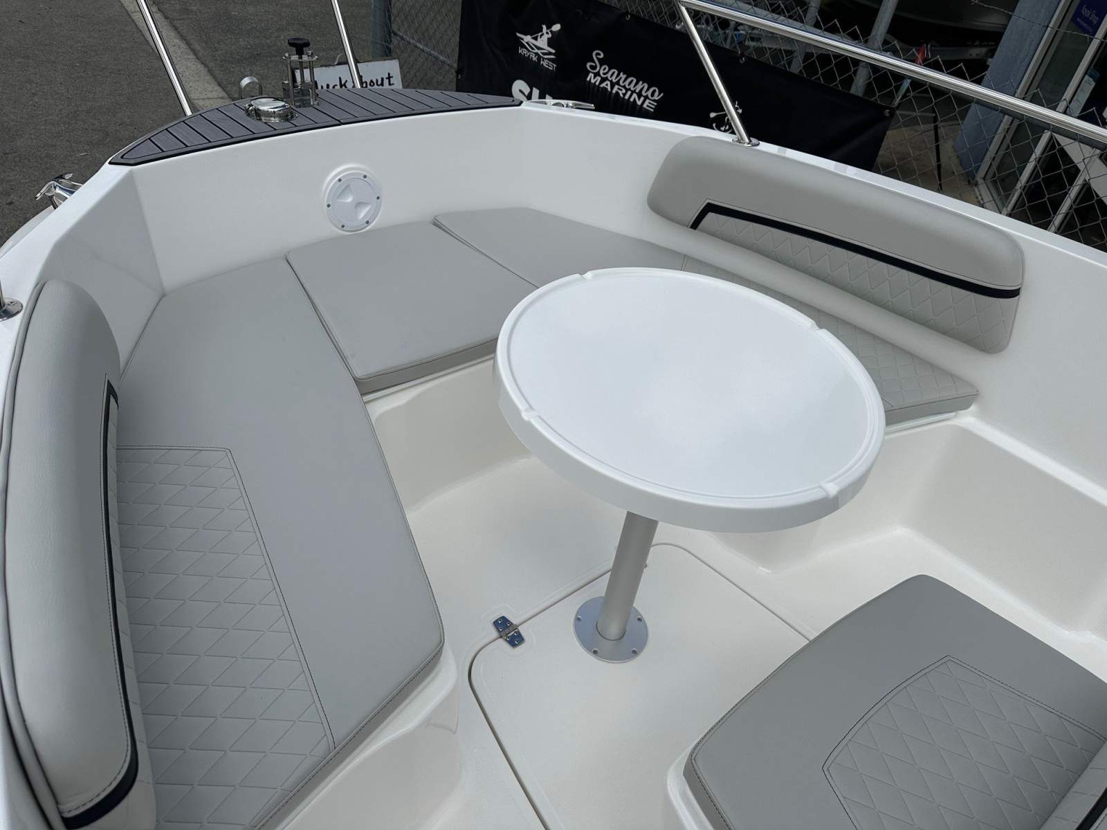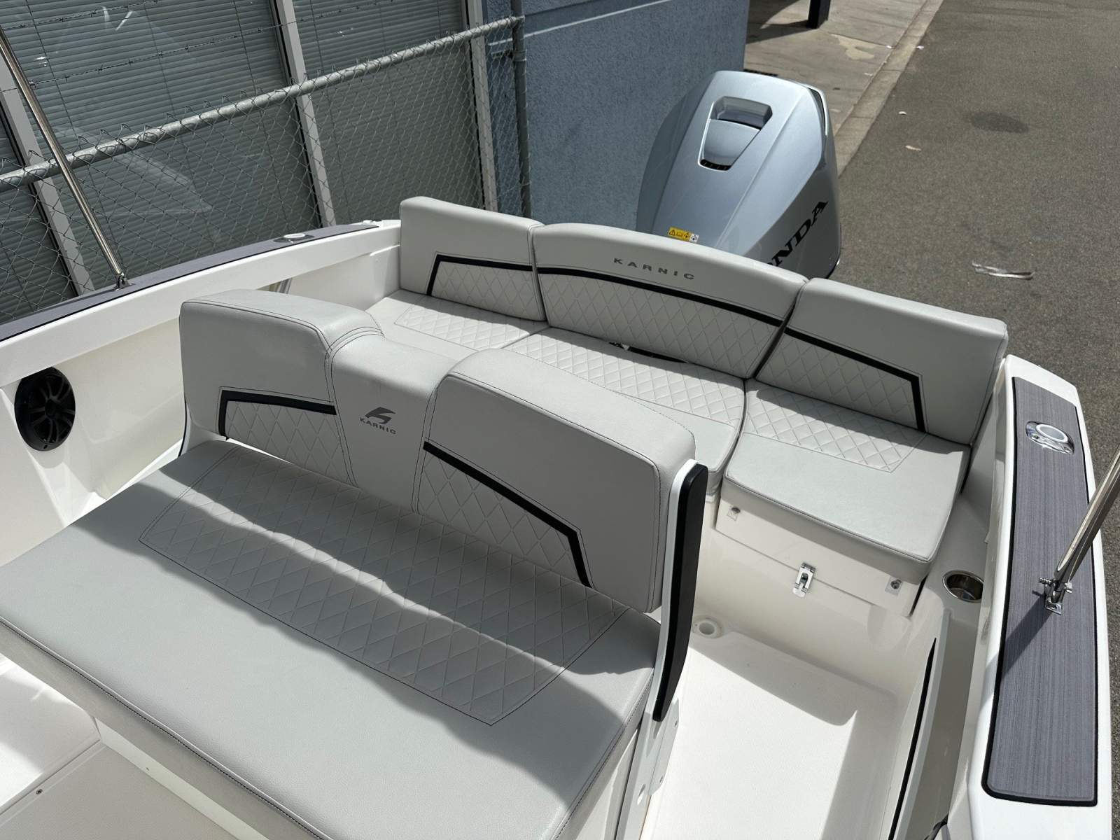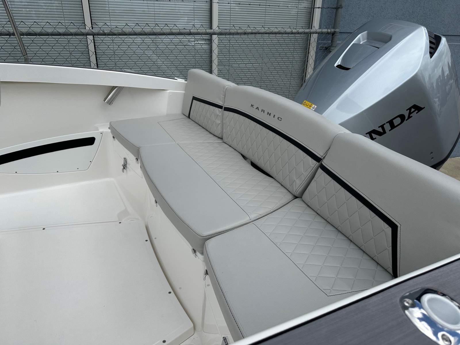 Continuous stern bench seat with backrests (cushions removable)