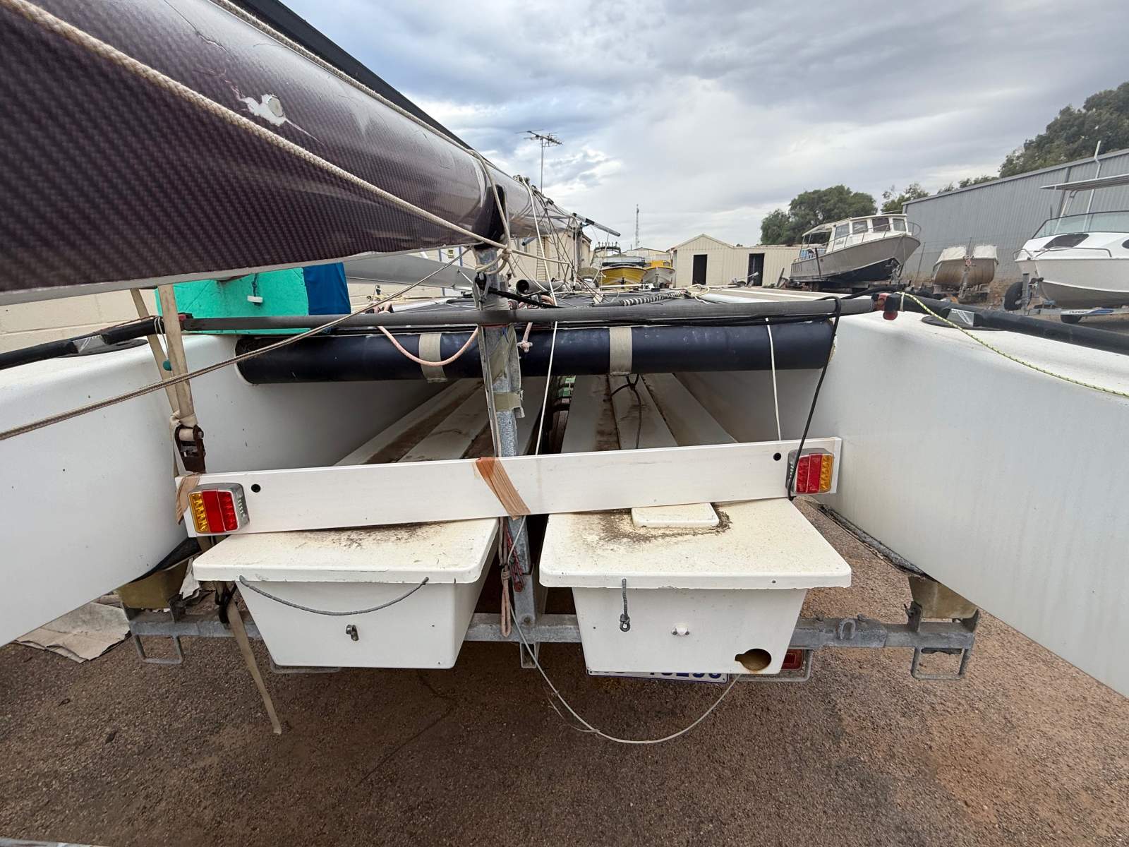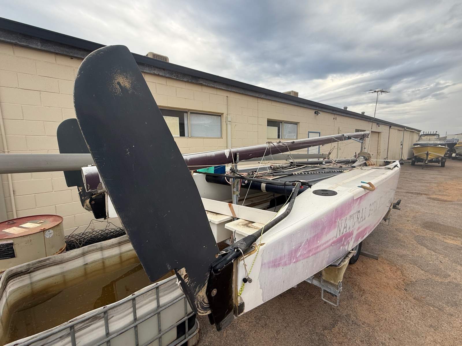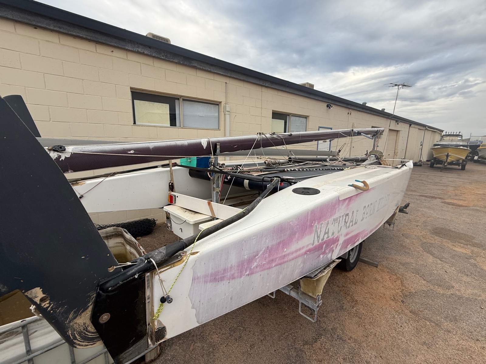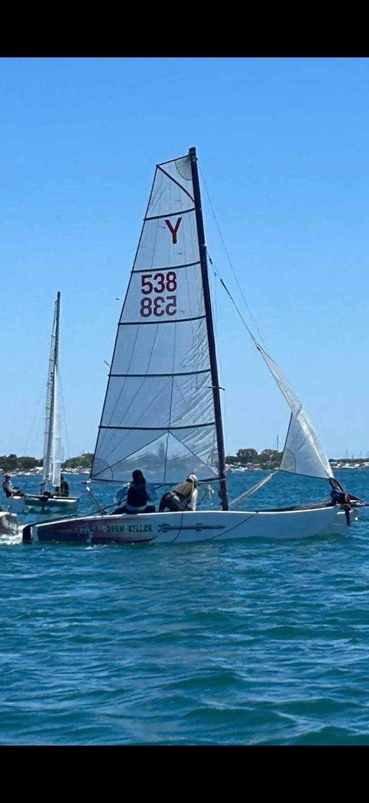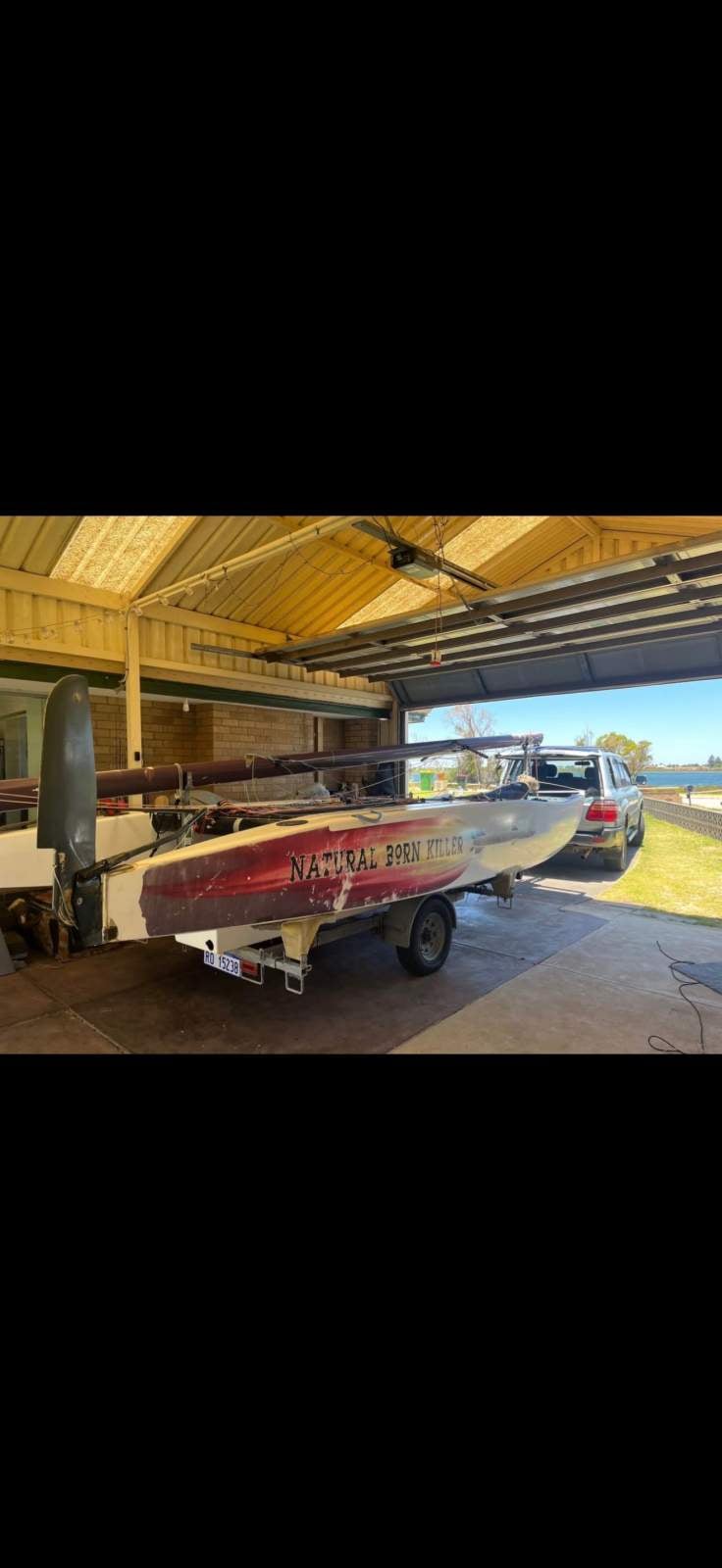 NATURAL BORN KILLER is a well known 6.1m cat as she was the Winner of the Yvonne Catamarang National Championships a while back, Shes still extremely fast and needs a good cut and polish but shes basically race ready still. She has a near new Extreme Sails spinnaker chute, Theres 3 spinnakers overal, 1 in great condition, 1 has had repairs and one needs a couple repairs. The Aluminium boom is great and has a Carbon Fibre as a spare, Theres also spare stays and centreboard. Good set of sails and a spare set. Sitting on a good Nolist Cat trailer that appears to be in good condition and is licensed.