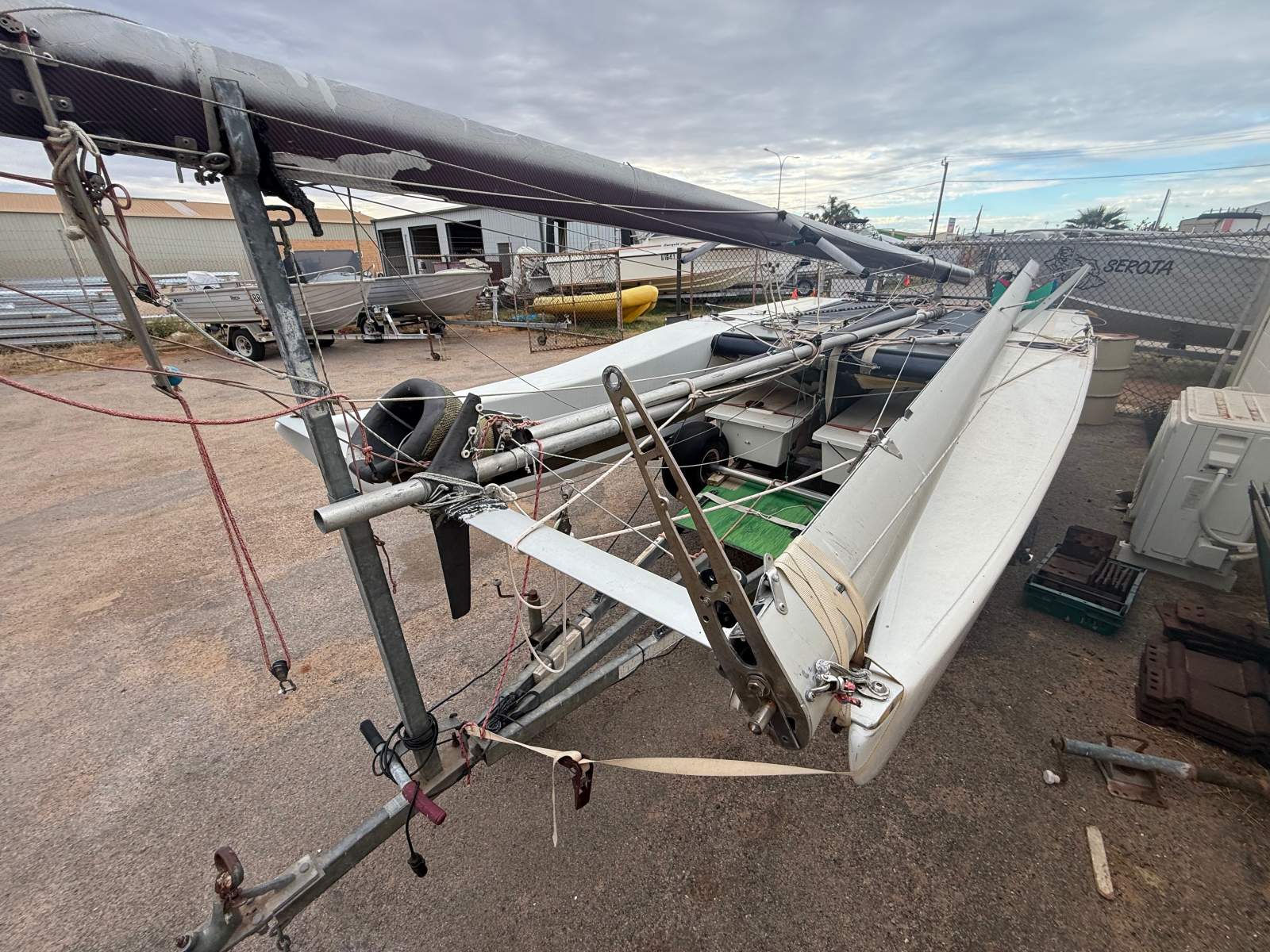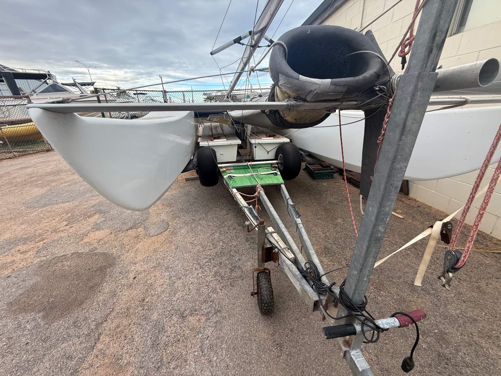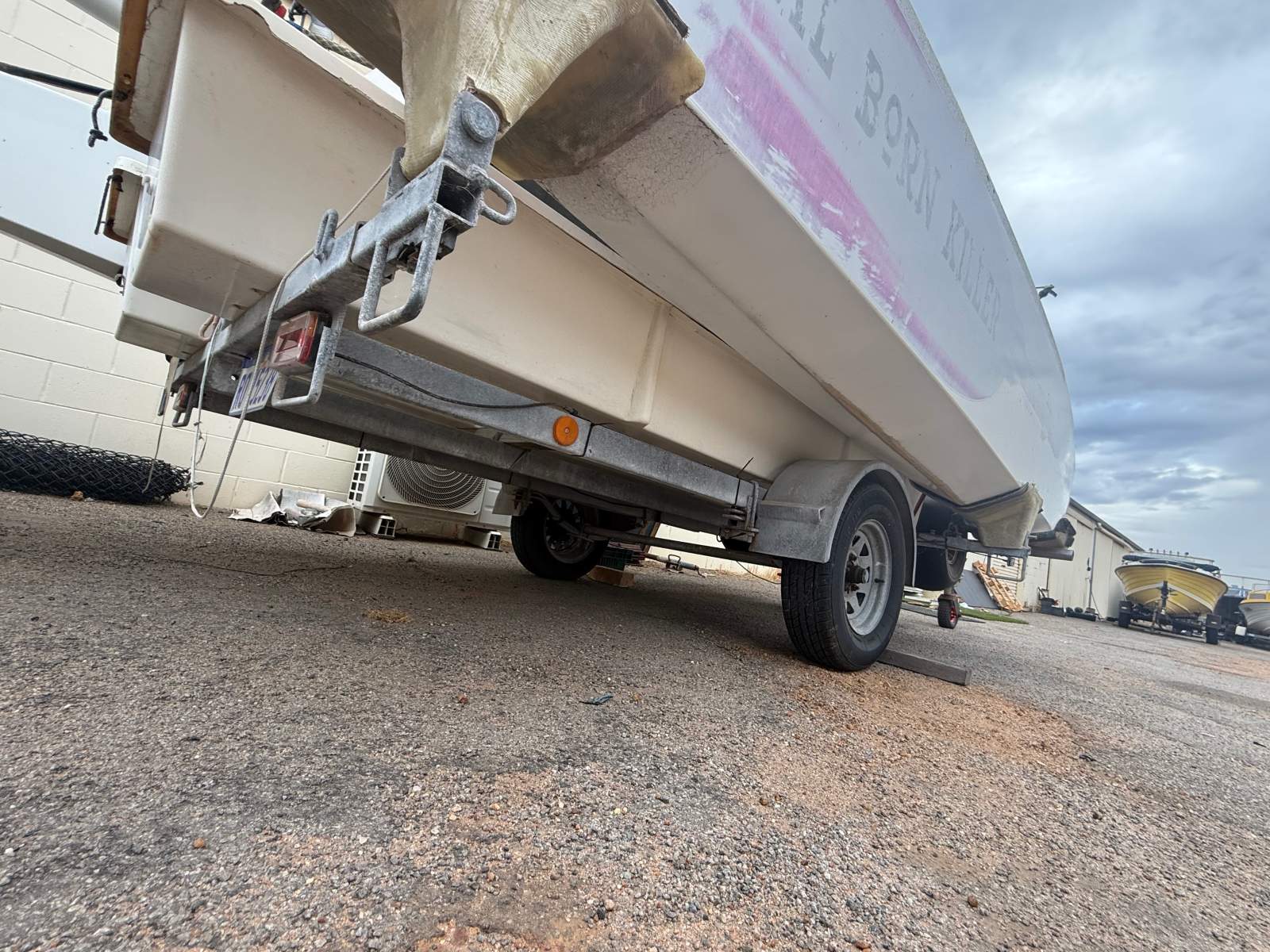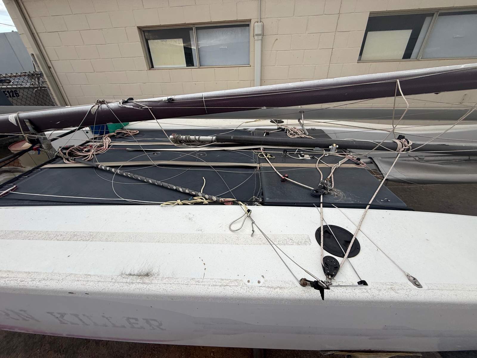 NATURAL BORN KILLER is a well known 6.1m cat as she was the Winner of the Yvonne Catamarang National Championships a while back, Shes still extremely fast and needs a good cut and polish but shes basically race ready still. She has a near new Extreme Sails spinnaker chute, Theres 3 spinnakers overal, 1 in great condition, 1 has had repairs and one needs a couple repairs. The Aluminium boom is great and has a Carbon Fibre as a spare, Theres also spare stays and centreboard. Good set of sails and a spare set. Sitting on a good Nolist Cat trailer that appears to be in good condition and is licensed.