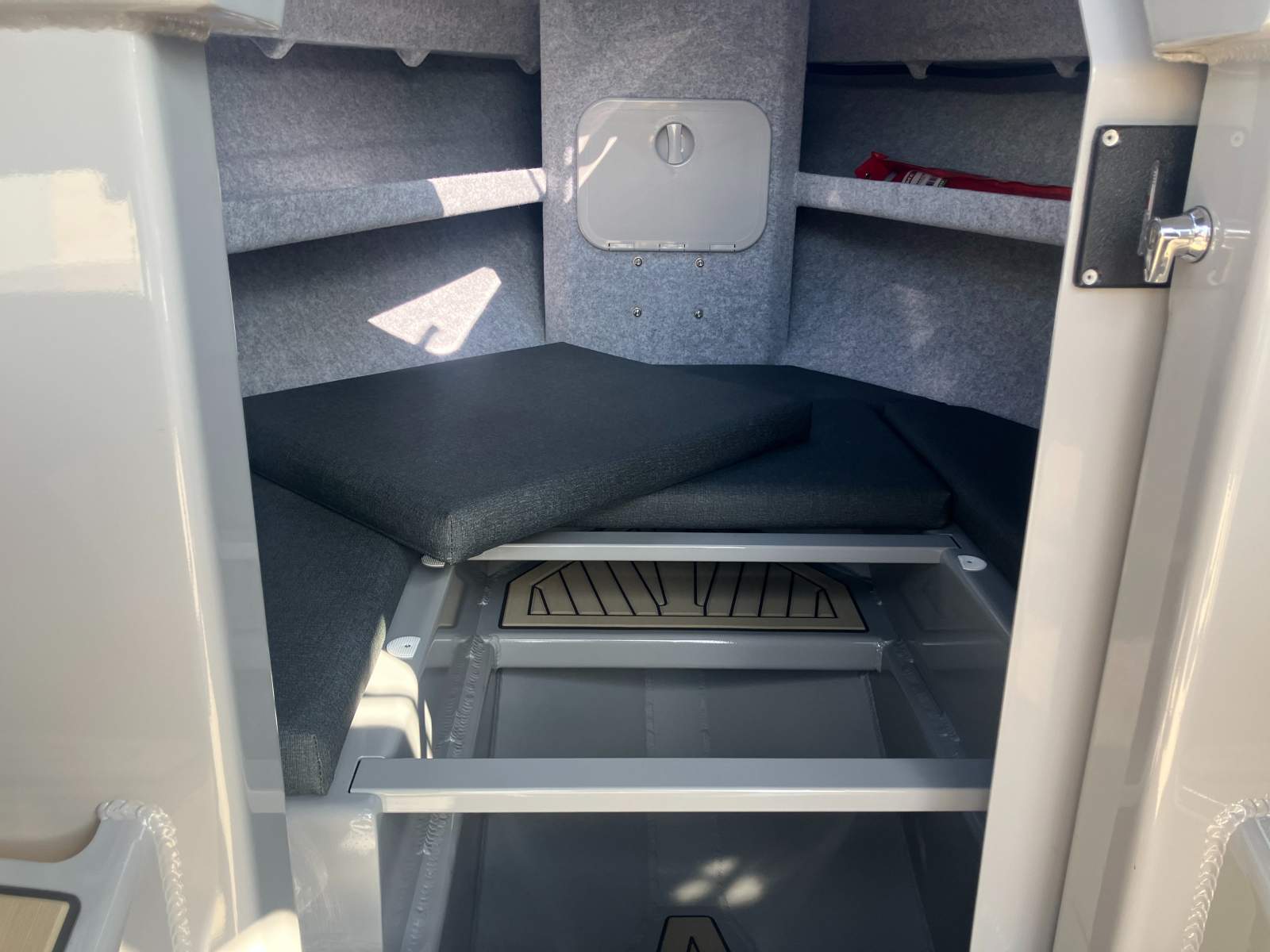 Custom Comfort: Port & Starboard King/Queen seating with storage drawers and a sliding cabin door for full weather protection.